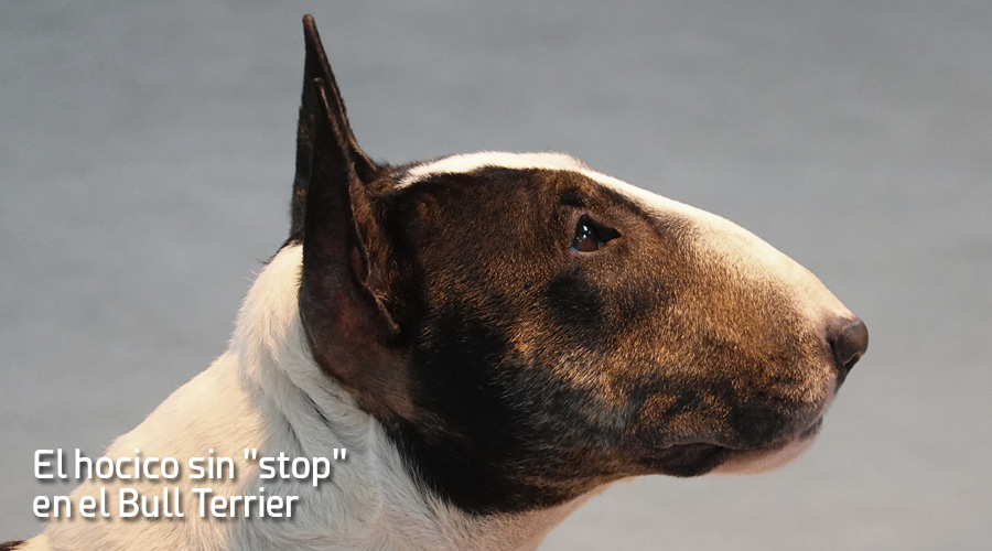 En morfología canina, el stop es el ángulo o depresión que separa la frente del hocico. En muchas razas es marcado (como en los Bulldogs), en otras más suave. Pero en el Bull Terrier, el estándar lo deja claro: no debe haber «stop» visible. El perfil del cráneo debe ser continuo, curvado hacia abajo desde la parte superior del cráneo hasta la trufa, sin ángulos ni interrupciones. Esta curva es lo que genera esa famosa forma de «huevo» que caracteriza a la raza.